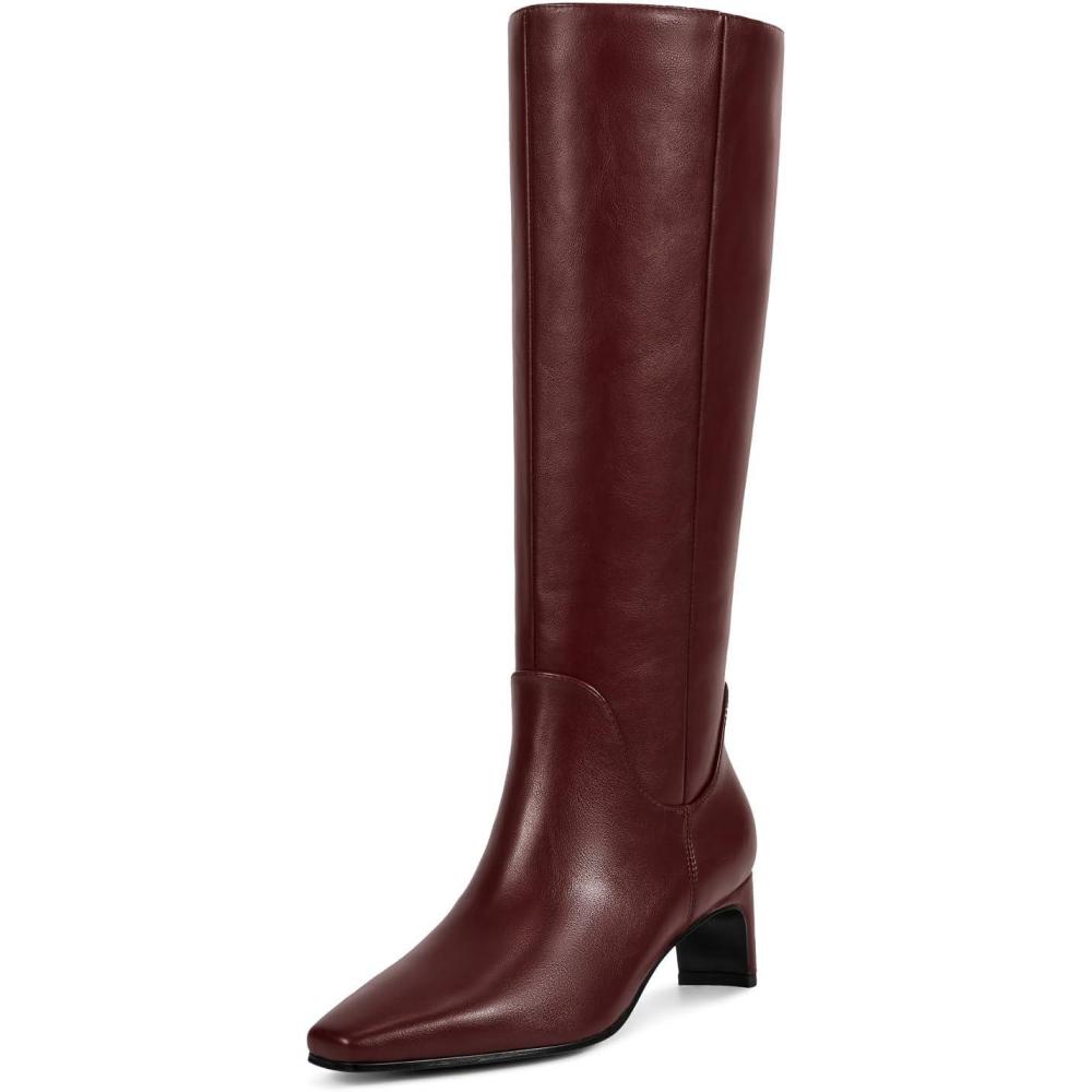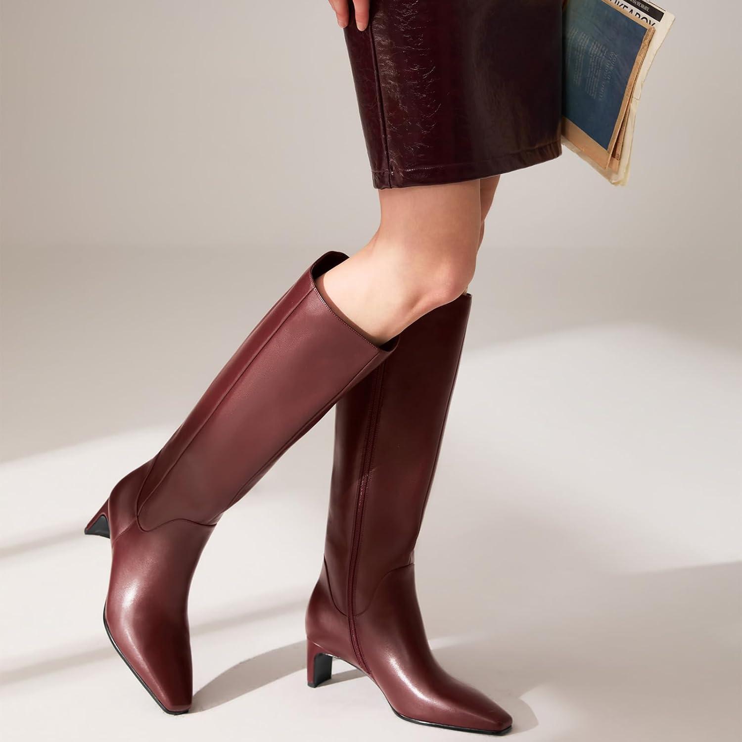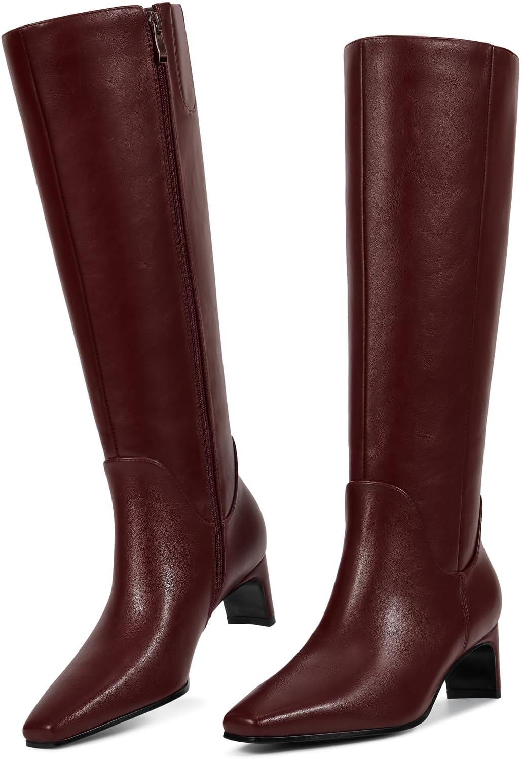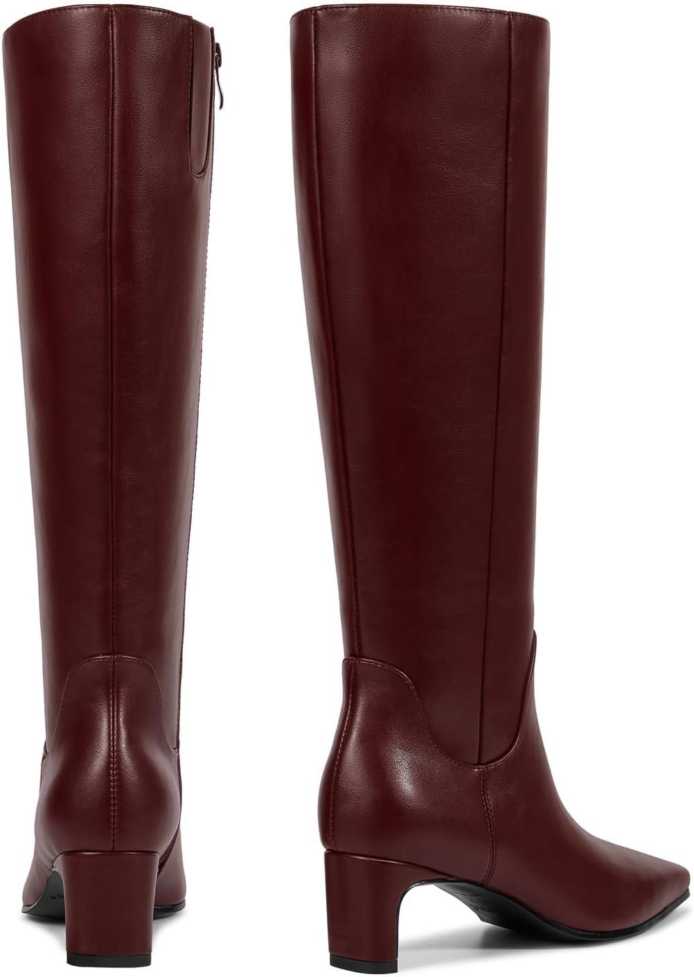 wetkiss Knee High Boots Women Slip On/Zipper Boots for Work Date Dress Party Club Shoes(Burgundy – Low Heel – Zipper)
