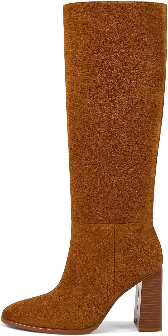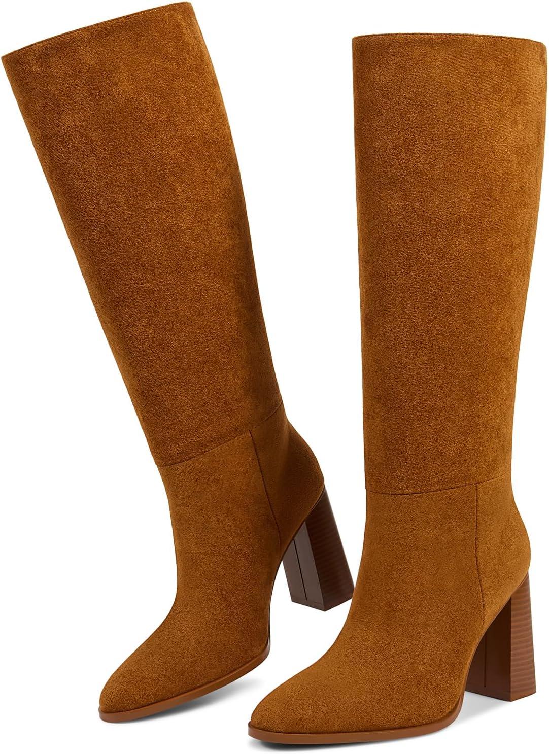 wetkiss Knee High Boots Women Slip On/Zipper Boots for Work Date Dress Party Club Shoes(Suede Dark Brown – Pull on)