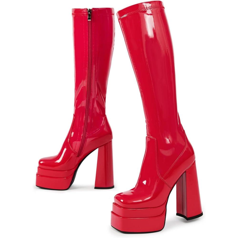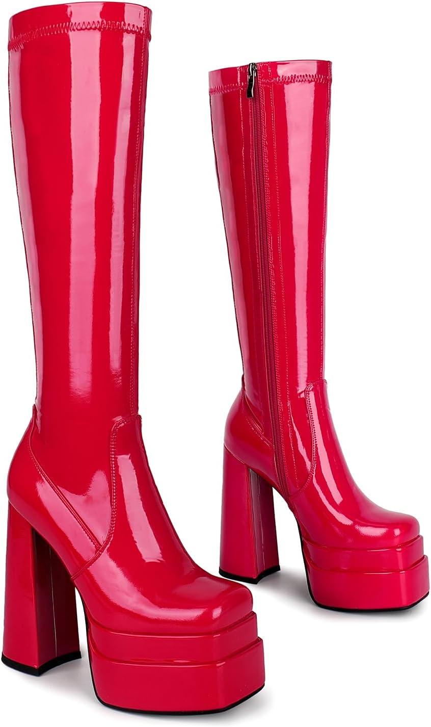 wetkiss Platform Knee High Boots Women Chunky High Heel Black Boots for Women Gogo Boot with Side Zipper Stretchy Party Festival Cosplay Halloween Boot Not for Wide Calf(D-platform Patent Red)