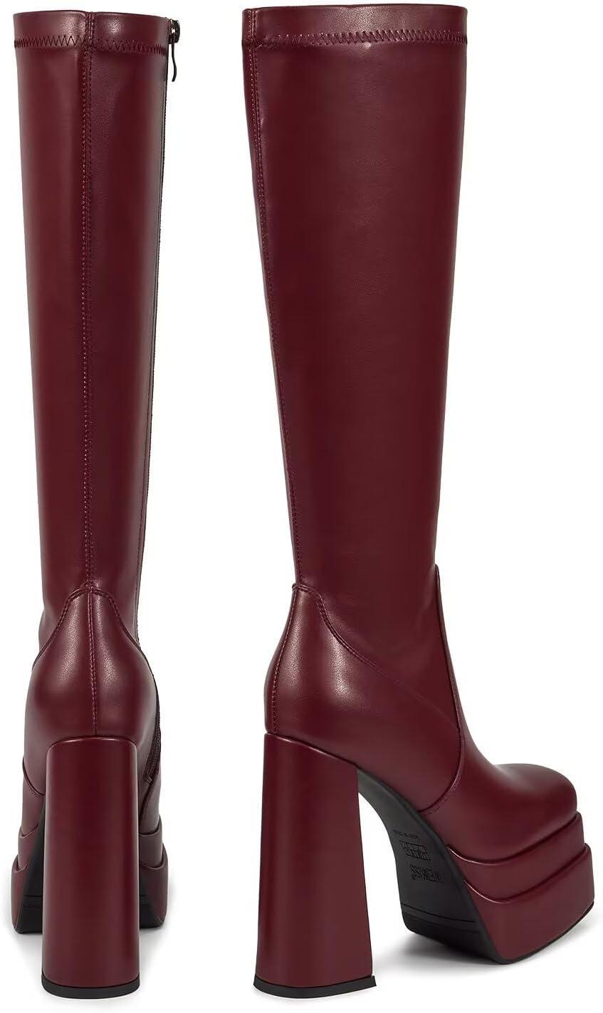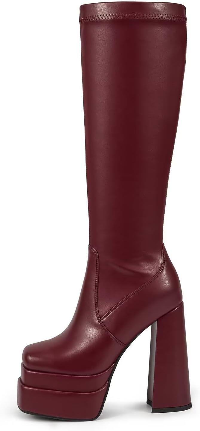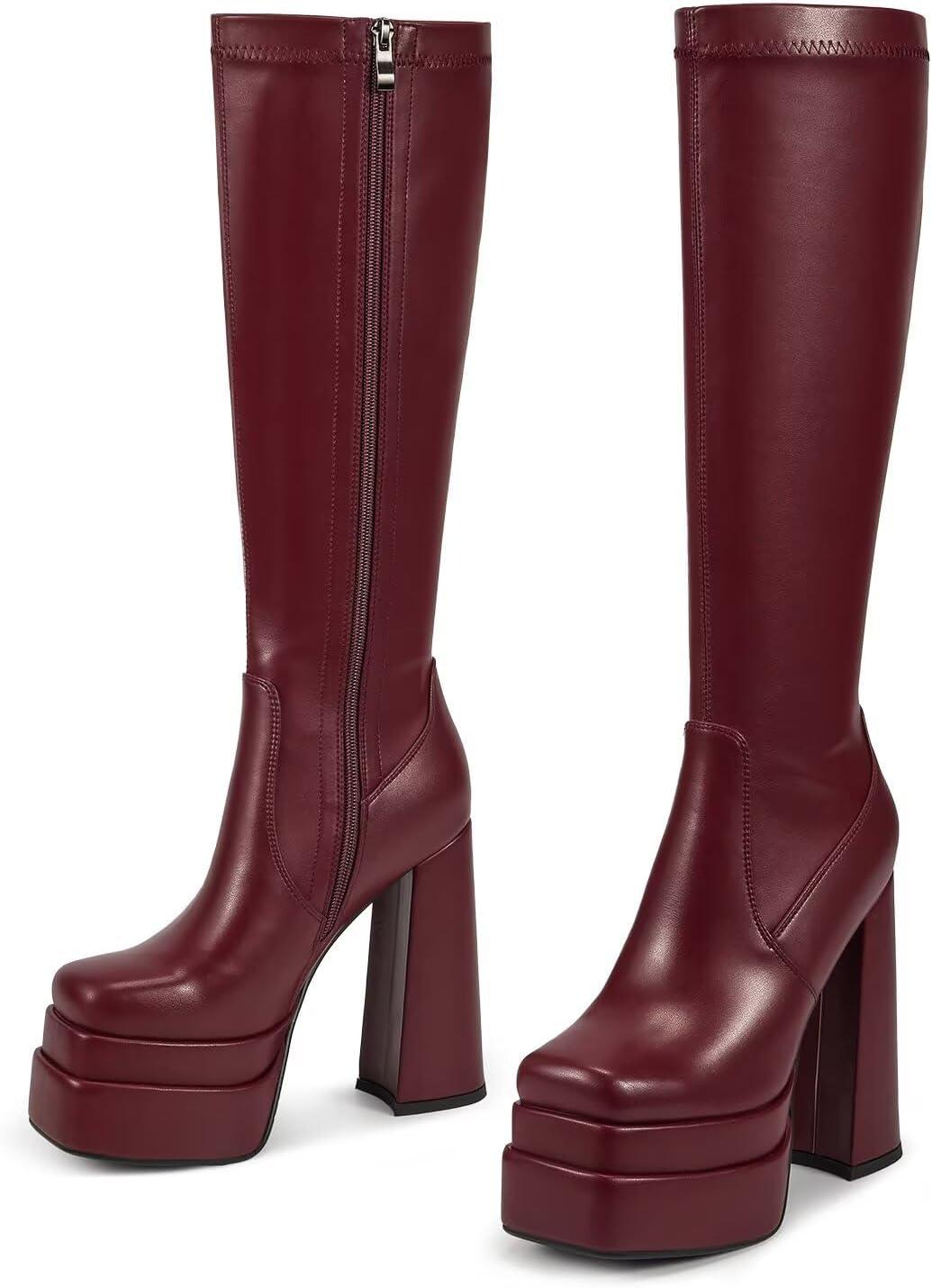 wetkiss Platform Knee High Boots Women Chunky High Heel Black Boots for Women Gogo Boot with Side Zipper Stretchy Party Festival Cosplay Halloween Boot Not for Wide Calf(F-platform Matte Burgundy)