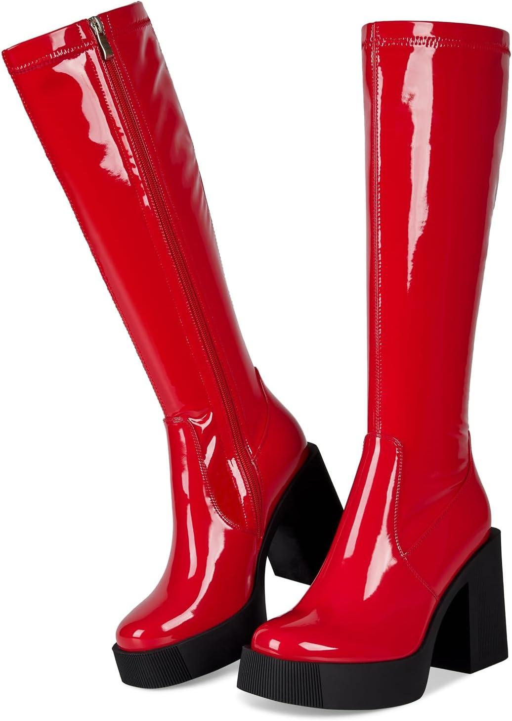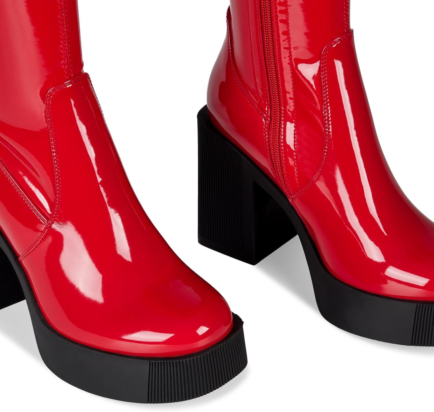 wetkiss Platform Knee High Boots Women Chunky High Heel Black Boots for Women Gogo Boot with Side Zipper Stretchy Party Festival Cosplay Halloween Boot Not for Wide Calf(Patent Red Rib Details)