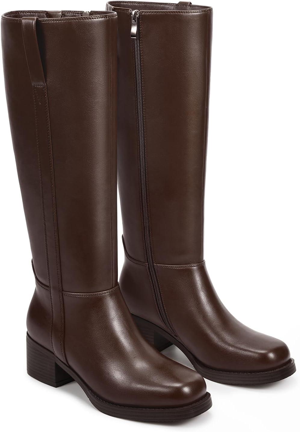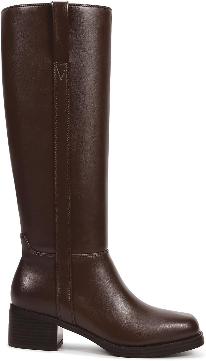 wetkiss Women’s Knee High Boots Platform Chunky Block Heel Riding Tall Boots Knee High Square Toe Long Boot Low Heel Campus Boot with Zipper(Coffee)
